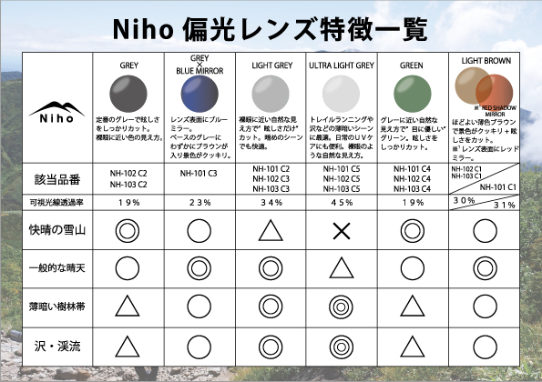 ※一般的な登山用レンズは可視光線透過率15%~20%前後と濃いめのカラーが多いのに対し、Nihoでは可視光線透過率30%~34%と薄めのカラーも多数ラインナップしています。レンズの色の濃淡に関わらず紫外線を99.9%カットします。