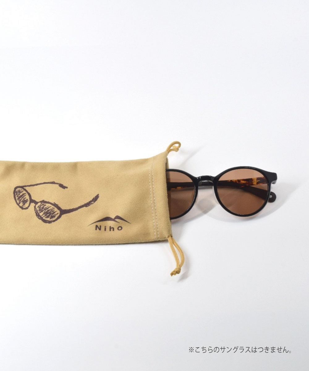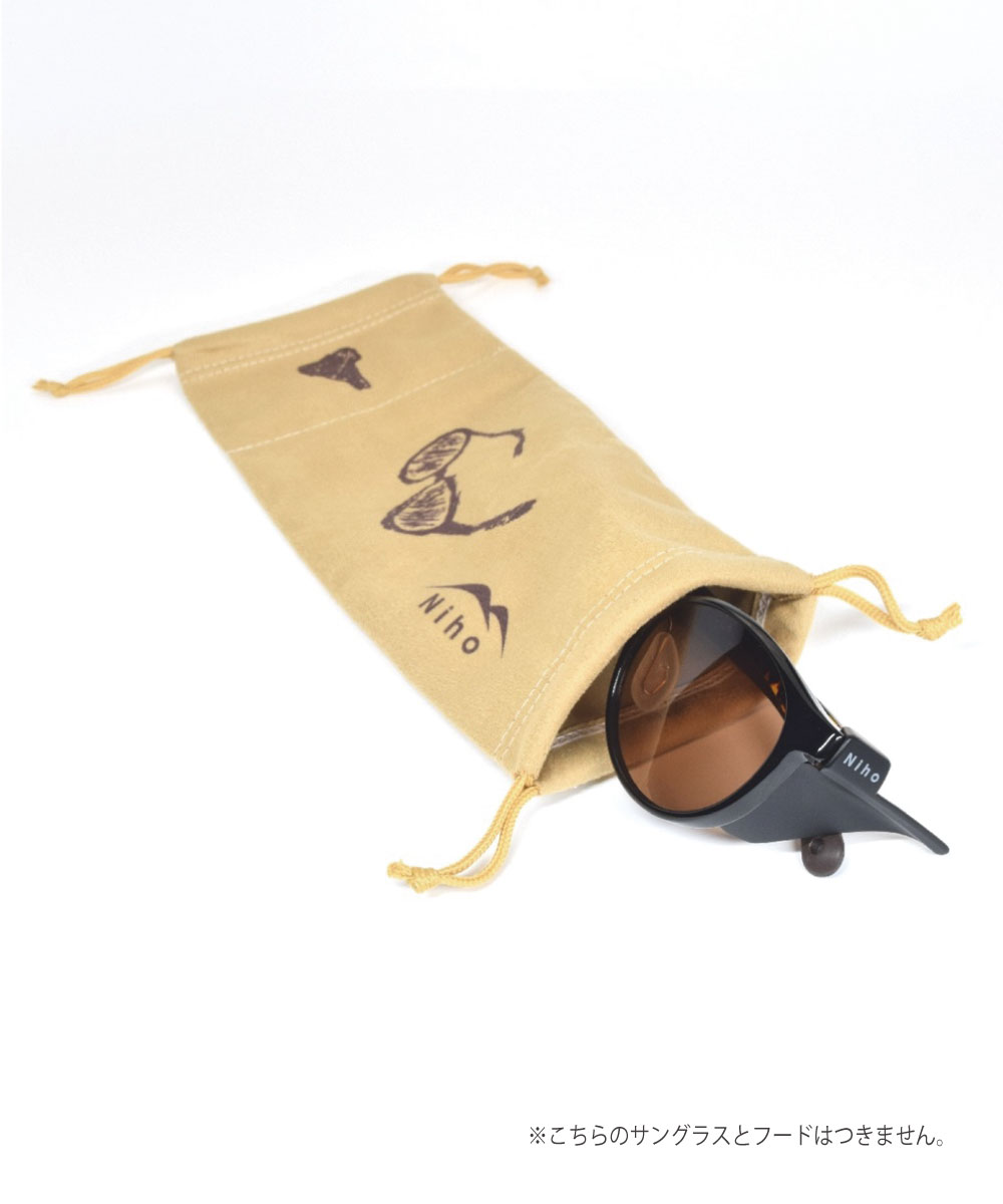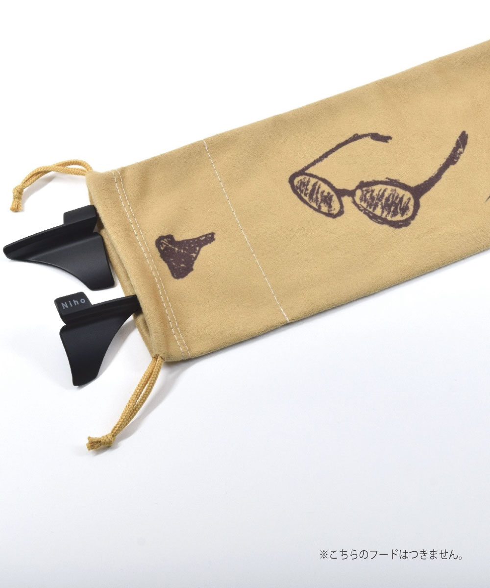 ポーチ本体には、アーティスト緒方敏明氏によるNihoをイメージしたイラストをプリントしました。厚手生地によりサングラス本体を汚れや傷から守ります。生地本体にマイクロファイバーを使っているためレンズが汚れた際はこのポーチで汚れを拭き取ることができます。またポーチが汚れた際は手洗いで洗濯が可能です。