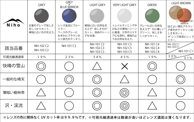 Niho 偏光レンズ特徴一覧